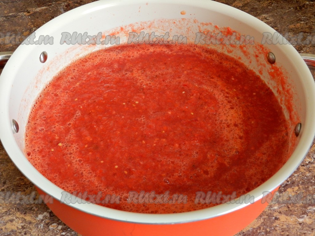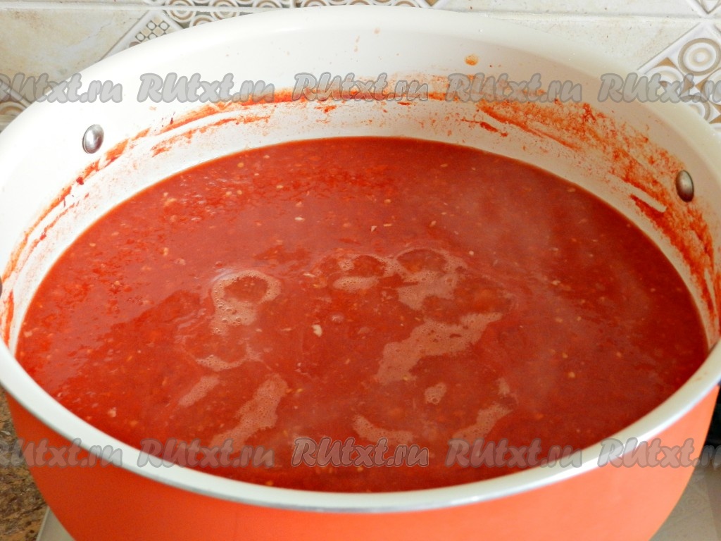 Варить около 40 минут, чтобы выпарилась лишняя жидкость и томатный соус стал густым.