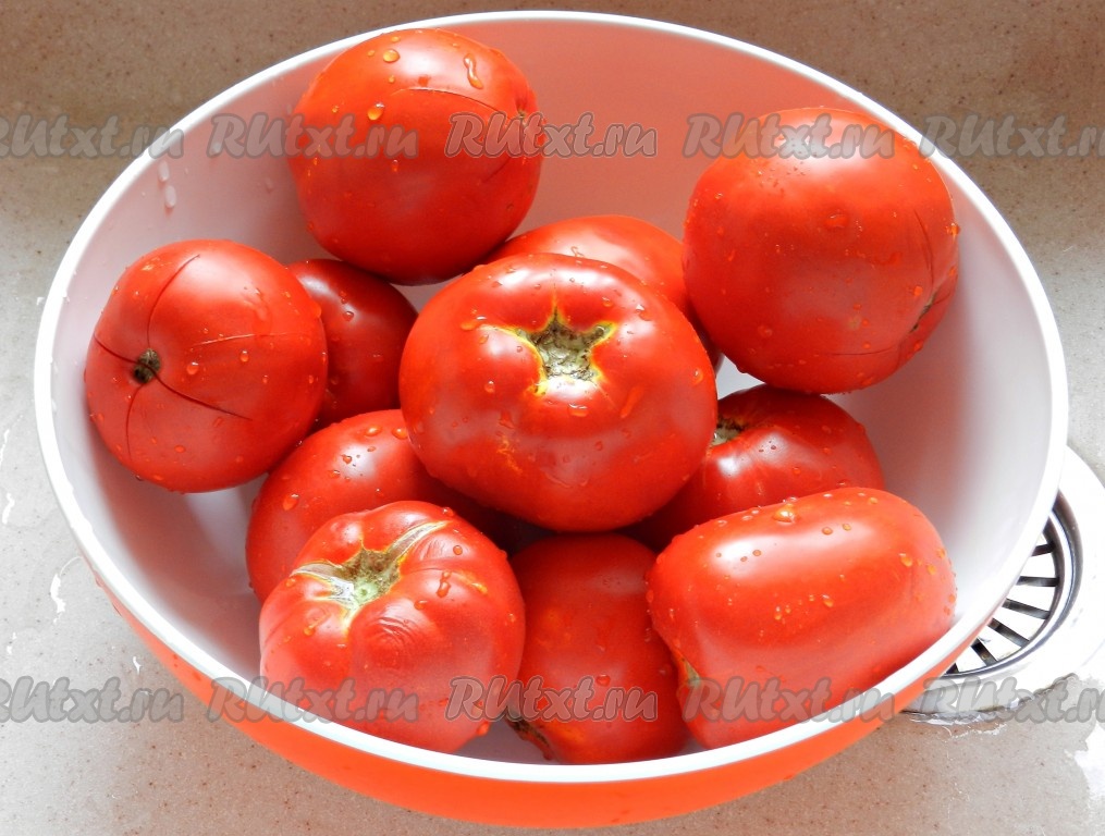 Залить помидоры кипятком и оставить на 5-10 минут, затем залить холодной водой.
