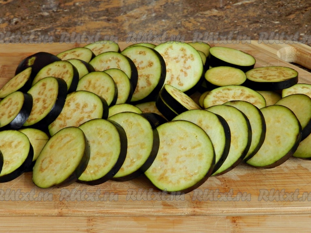 Нарезать баклажаны кружочками, крупные кружочки можно разрезать пополам.