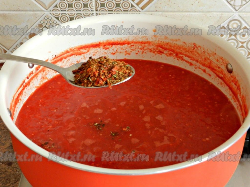 В томатный соус в процессе приготовления добавить соль, сахар и специи, перемешать.