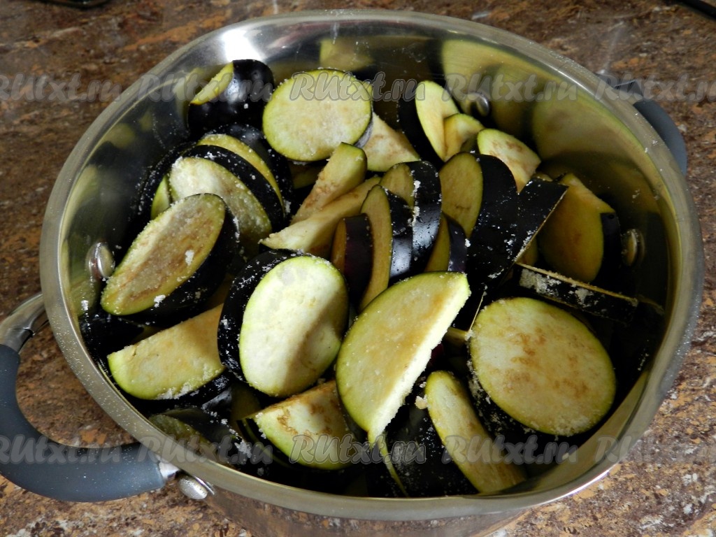 Нарезанные баклажаны пересыпать солью.