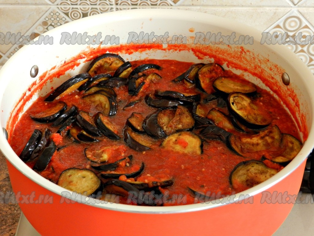 Затем выложить в соус обжаренные баклажаны.