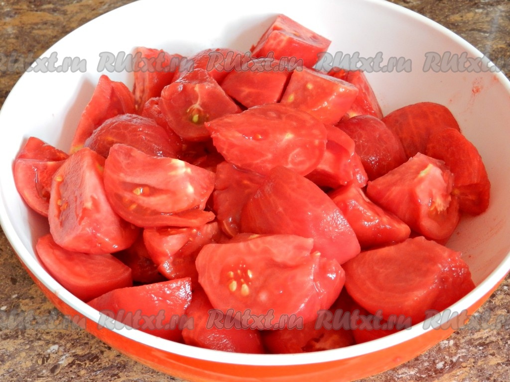 Очистить помидоры от кожицы и нарезать произвольно.