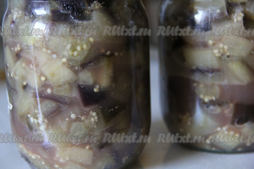 Готовые баклажаны разложить по подготовленным простерилизованным банкам, закрыть прокипячёнными крышками. Баночки перевернуть и укутать в тёплое одеяло до полного остывания.