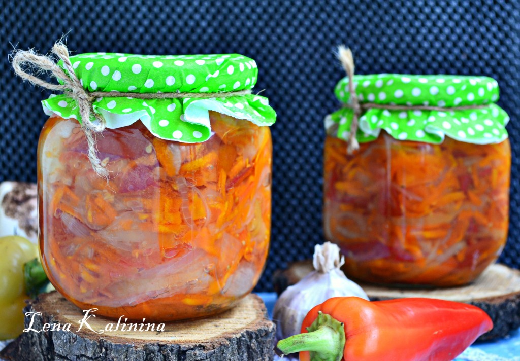 Прикрыть банки крышками и поставить кастрюлю на средний огонь. Когда вода закипит, огонь уменьшить и стерилизовать салат (при слабом кипении воды) 20 минут. Готовый очень вкусный салата из помидоров, перца, моркови и лука закрутить крышками, перевернуть и укутать до полного остывания. Хранить салат можно при комнатной температуре. Замечательная закуска для холодных зимних дней, попробуйте!