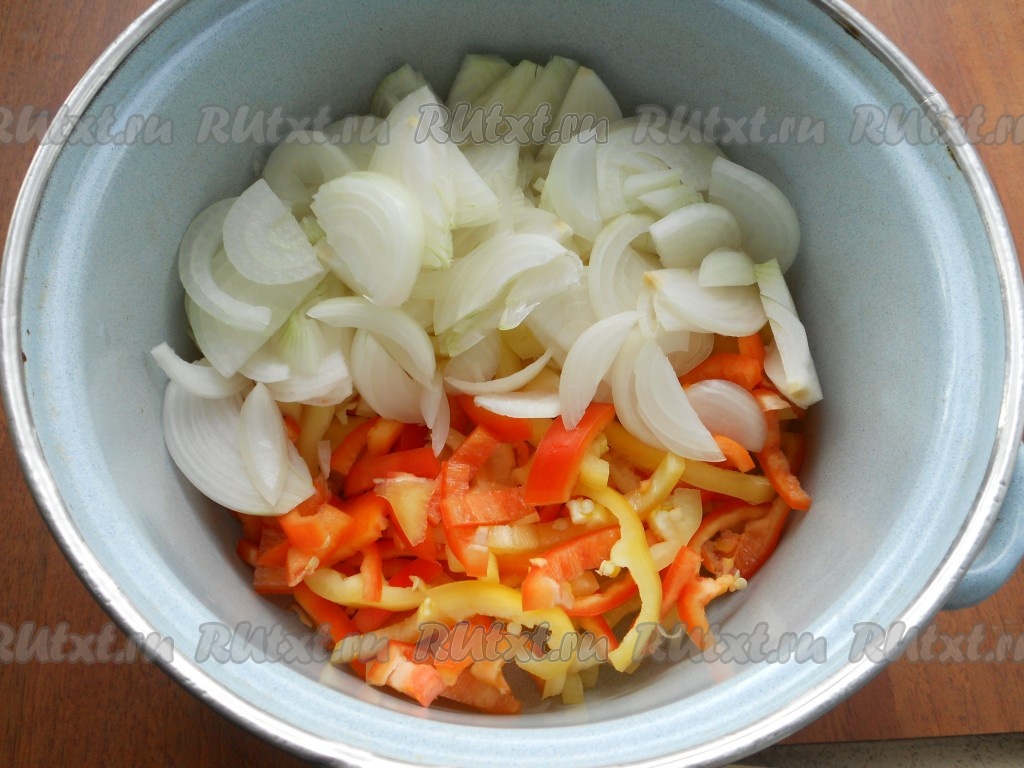 Сладкий перец (лучше использовать разных цветов) очистить от семян и нарезать соломкой. Добавить нарезанный полукольцами репчатый лук.