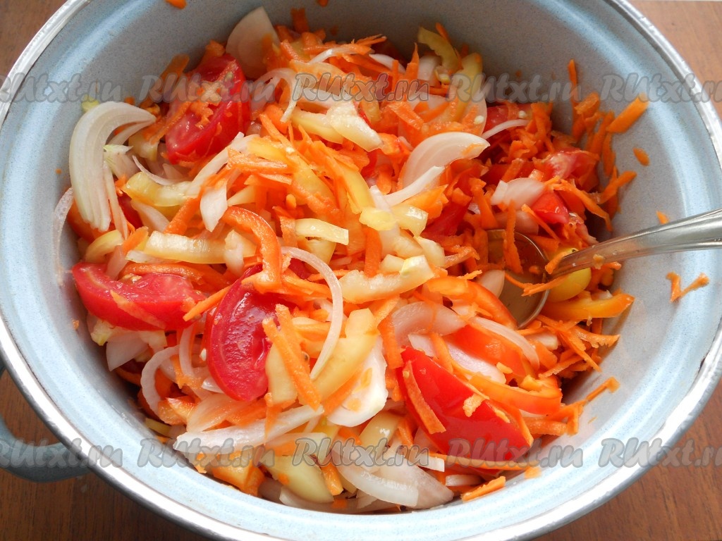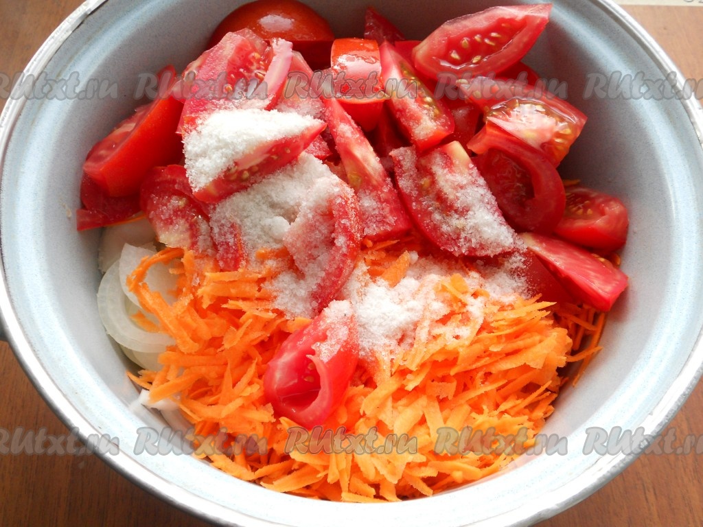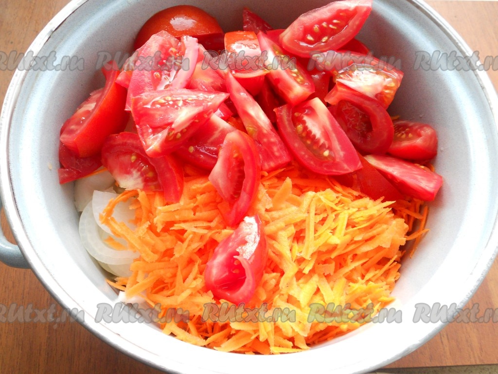 Сюда же добавить натертую на крупной терке морковь и нарезанные дольками свежие помидоры.
