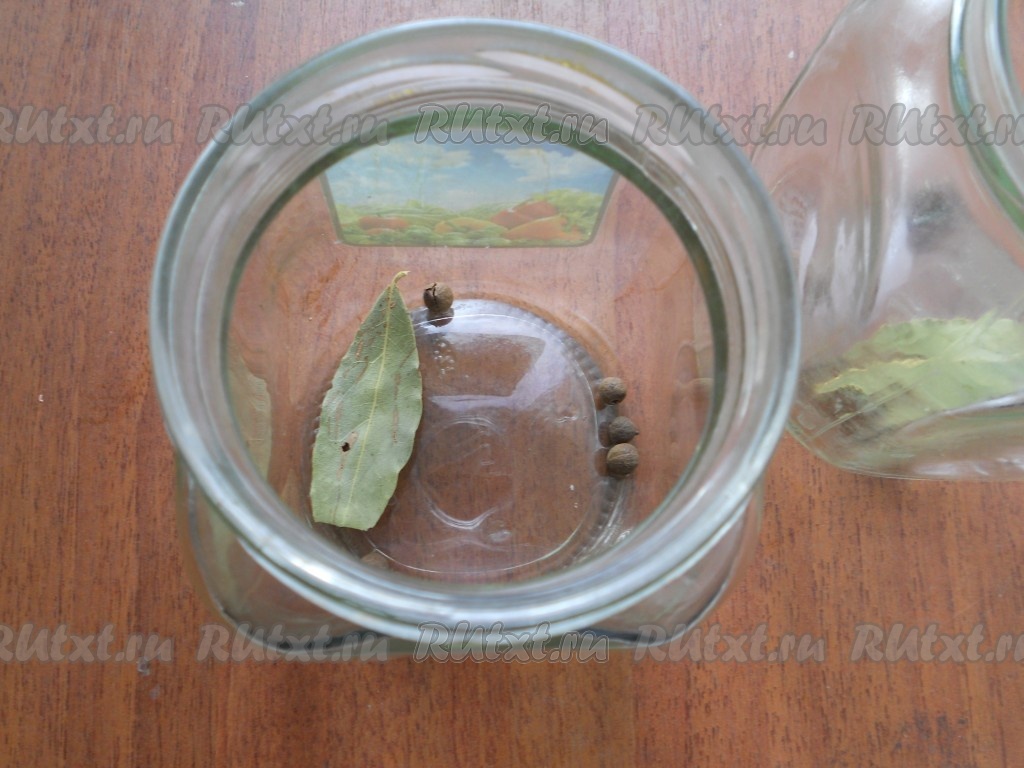 Банки и крышки простерилизовать. На дно каждой банки поместить по лавровому листику и по несколько горошин душистого перца.