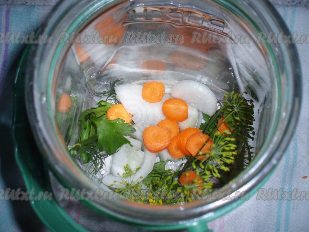 Банки стерилизовать привычным способом. Простерилизованные банки вынуть и поставить на полотенце. На дно каждой баночки поместить зелень укропа и петрушки, кружочки лука и моркови, зубчики чеснока.