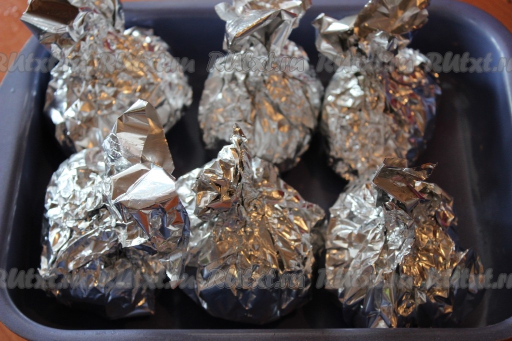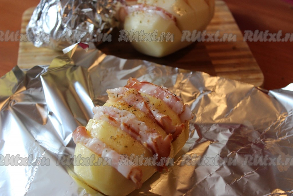 Затем выложить картофель в фольге в жаропрочную форму. Поставить в разогретую духовку и запекать при 200 градусах примерно 35-40 минут. Время запекания зависит от величины картофеля. Готовность картошки-гармошки с беконом можно проверить зубочисткой (если зубочистка легко входит в картофель - значит она готова).