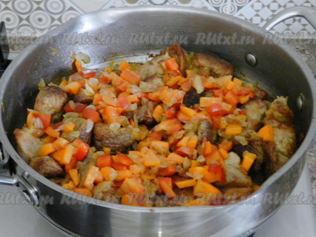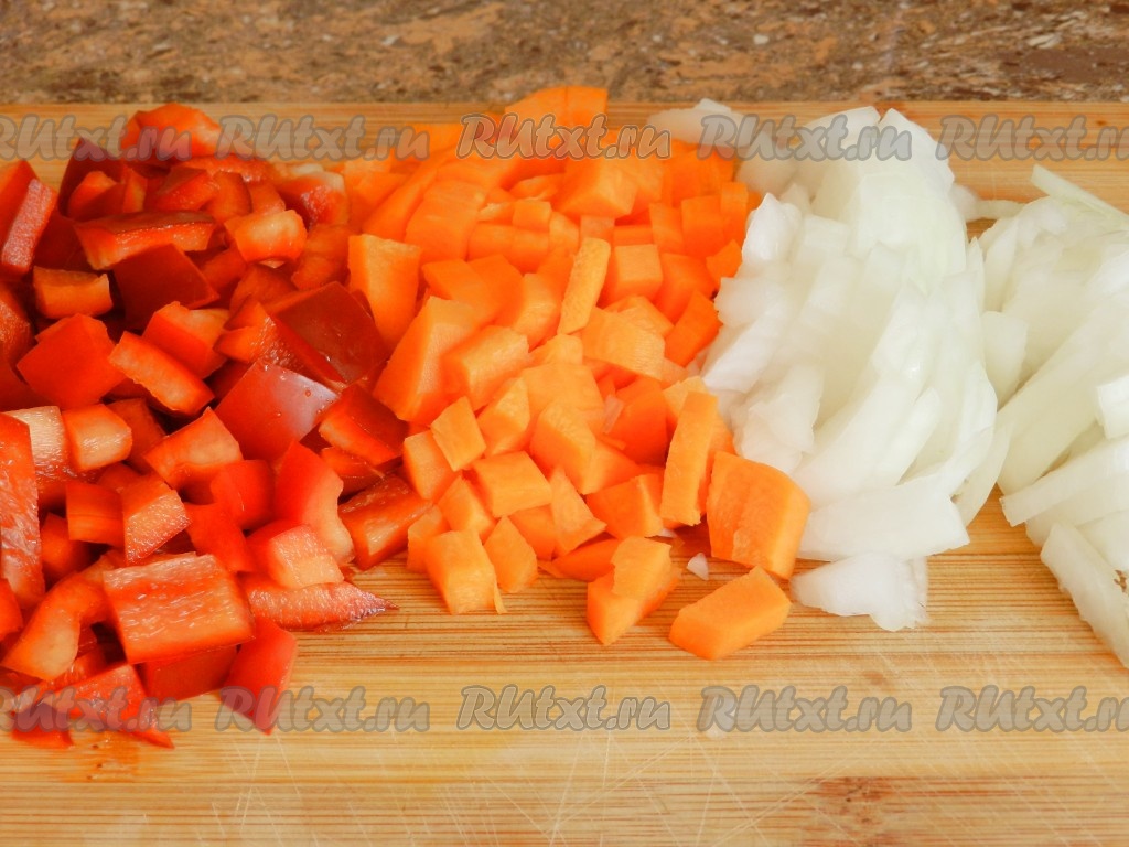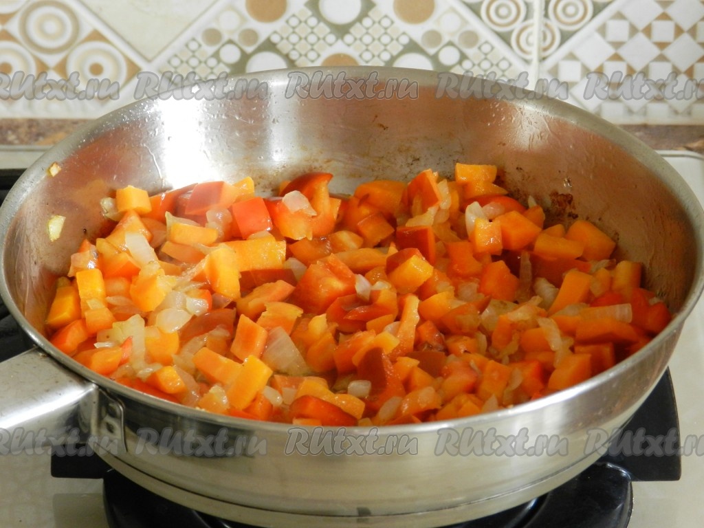 В отдельной сковороде обжарить лук и морковь до золотистого цвета, иногда помешивая, затем добавить болгарской перец и немного обжарить все вместе. Посолить и поперчить.
