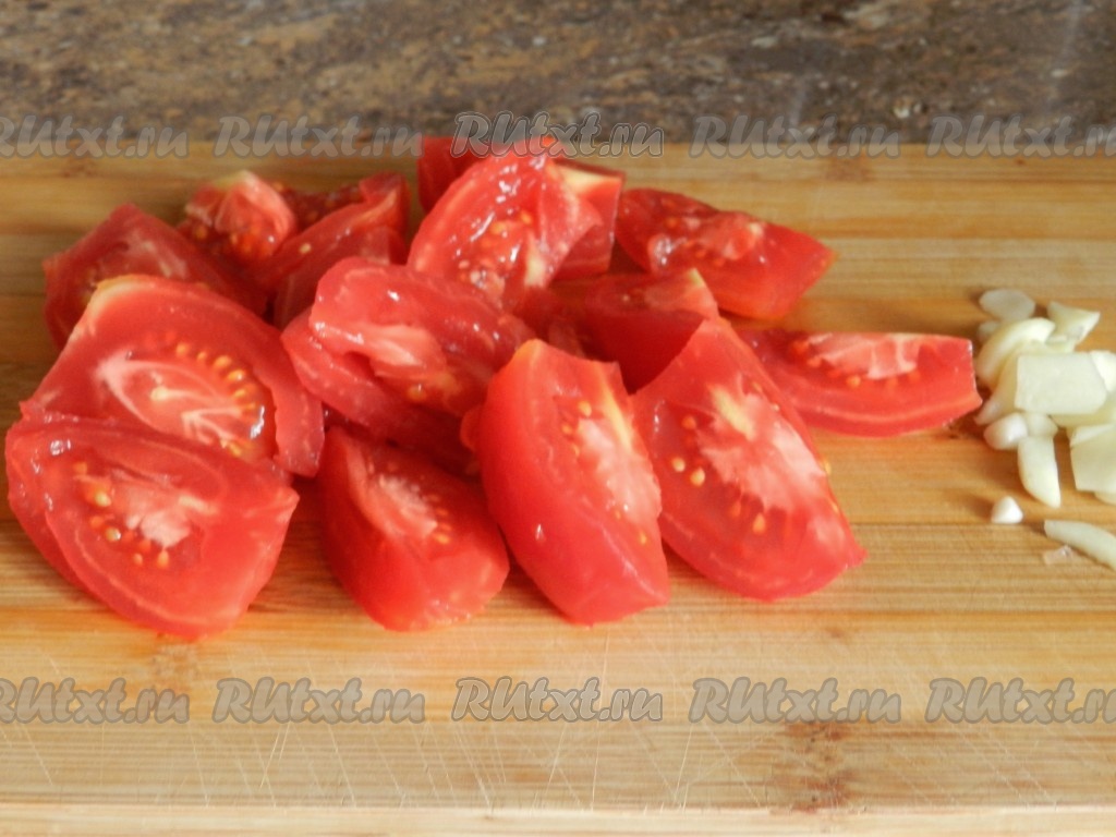 Чеснок нарубить ножом. С помидоров снять кожицу и нарезать на четвертинки.