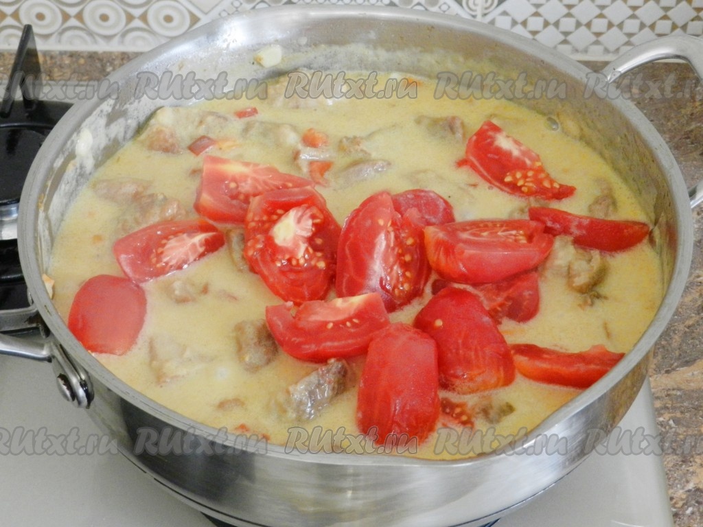 Затем добавить к мясу помидоры и готовить еще 10 минут, периодически помешивая и не давая соусу слишком сильно кипеть.