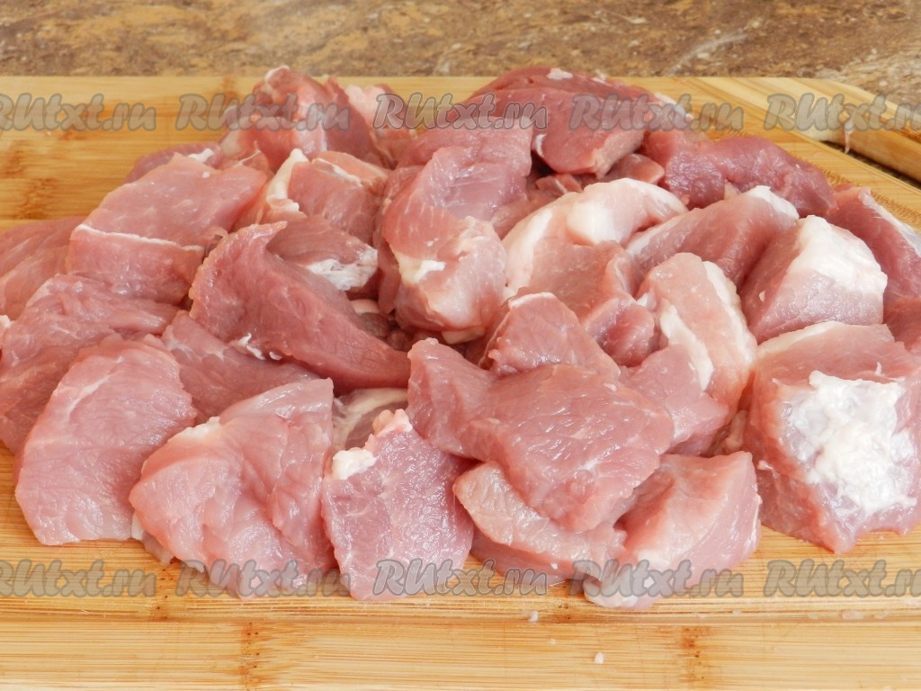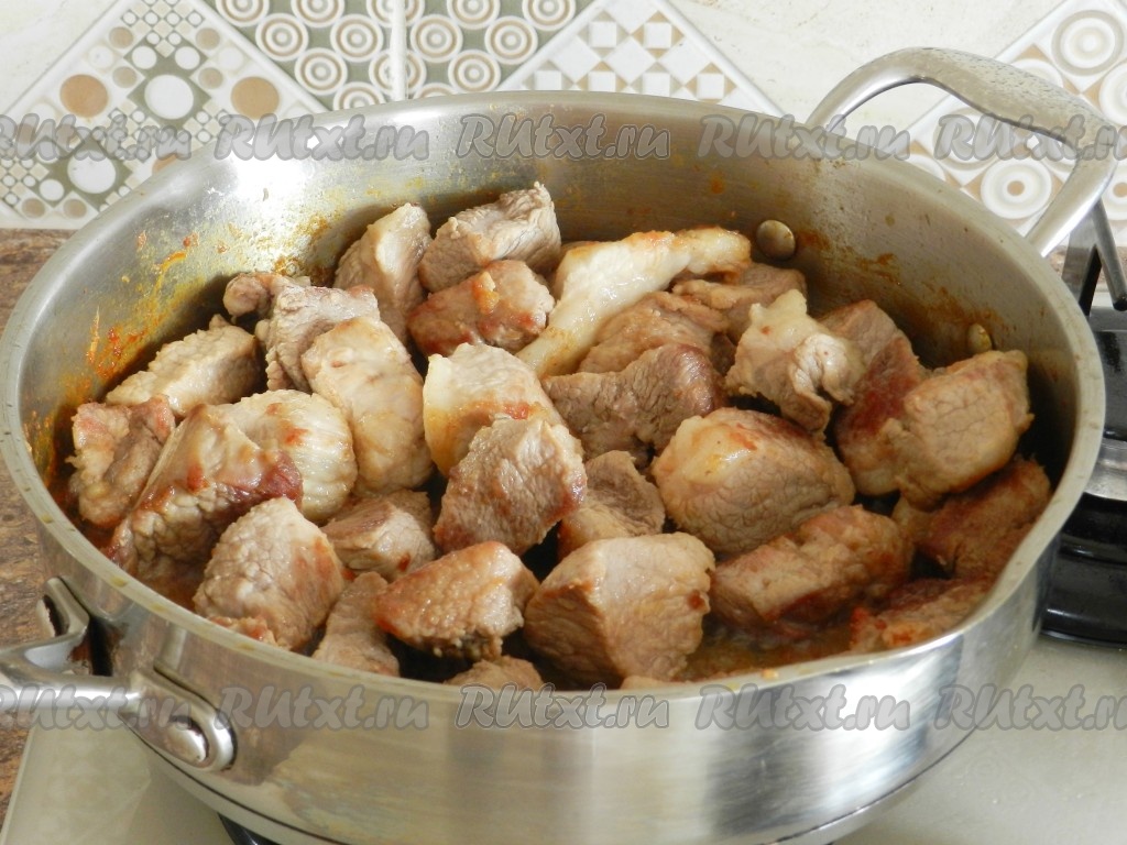 В глубокой сковороде разогреть масло и обжарить кусочки свинины со всех сторон до золотистого цвета. Влить немного воды, около 100 мл, уменьшить огонь и тушить мясо под крышкой в течение часа. В процессе приготовления приправить солью и перцем по вкусу.