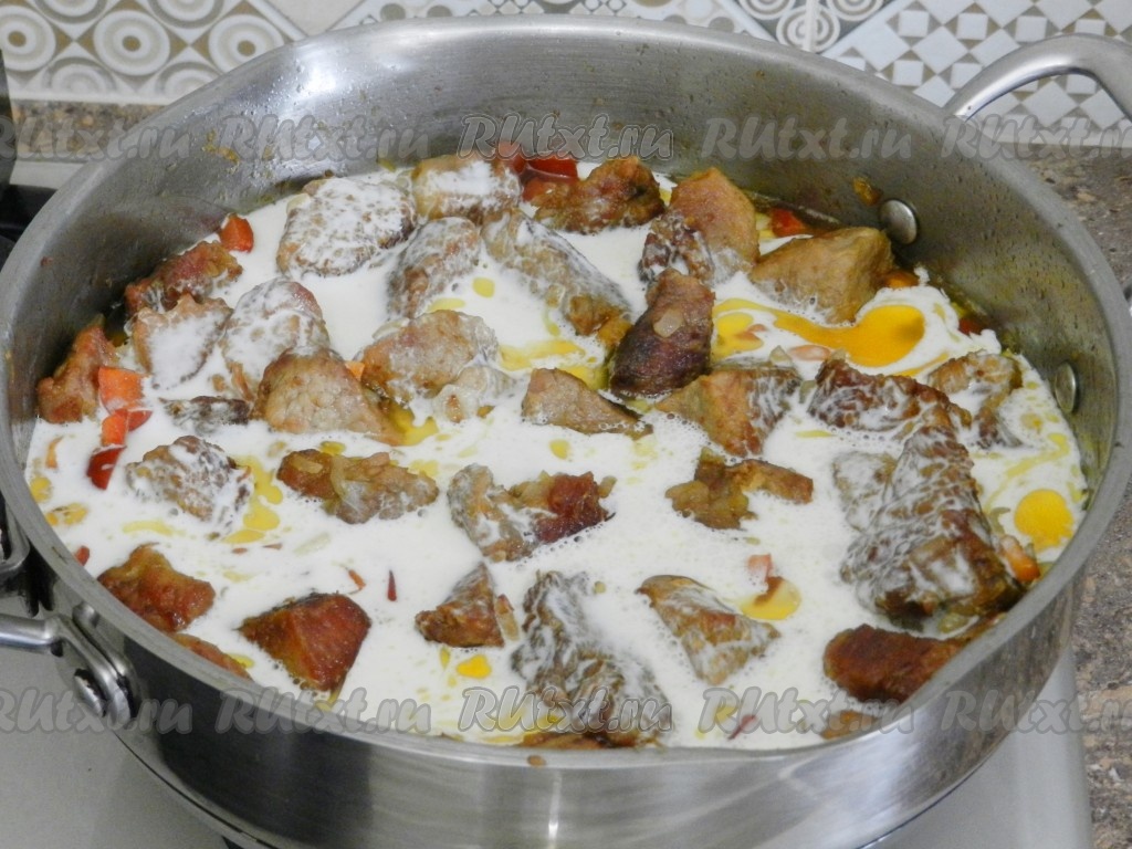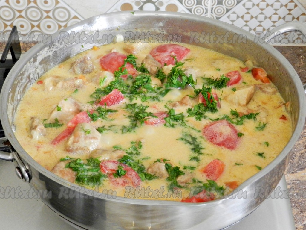 Влить сметану в сковороду, перемешать. Довести до кипения, уменьшить огонь, накрыть крышкой и тушить свинину с овощами в соусе около 20 минут. Если соус кажется вам слишком густым, влейте немного кипяченой воды и перемешайте до однородности.