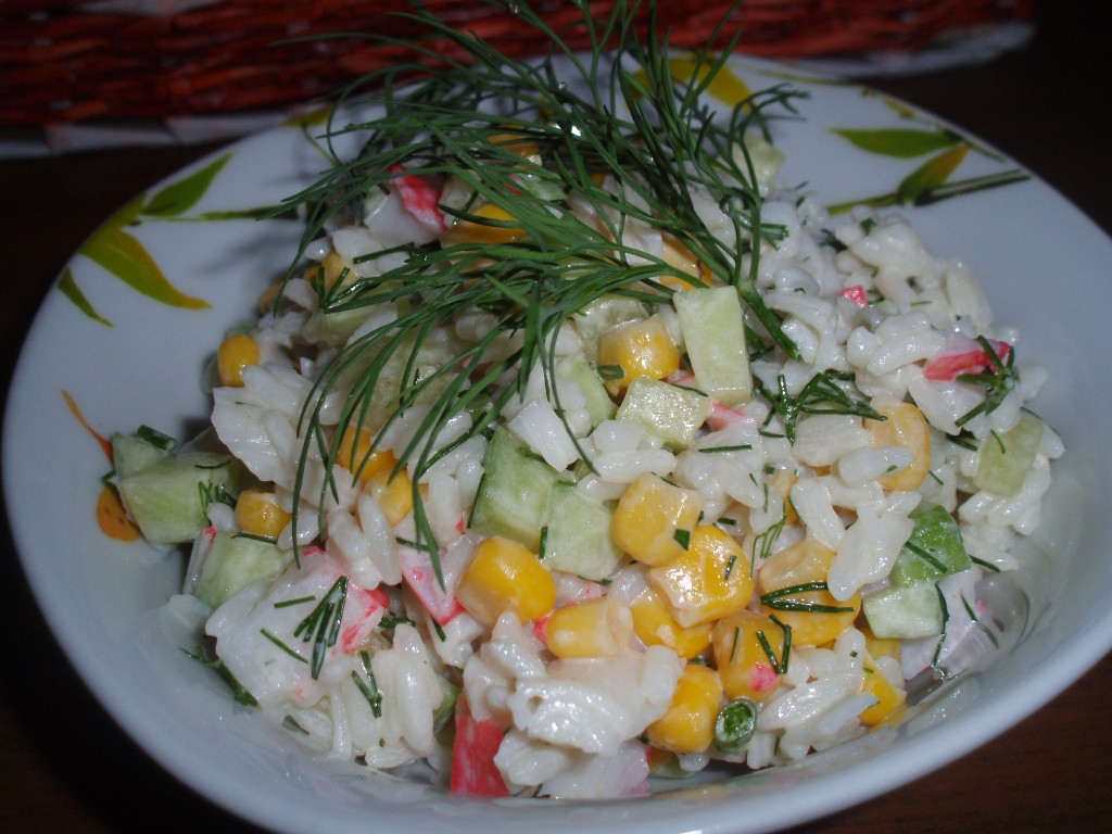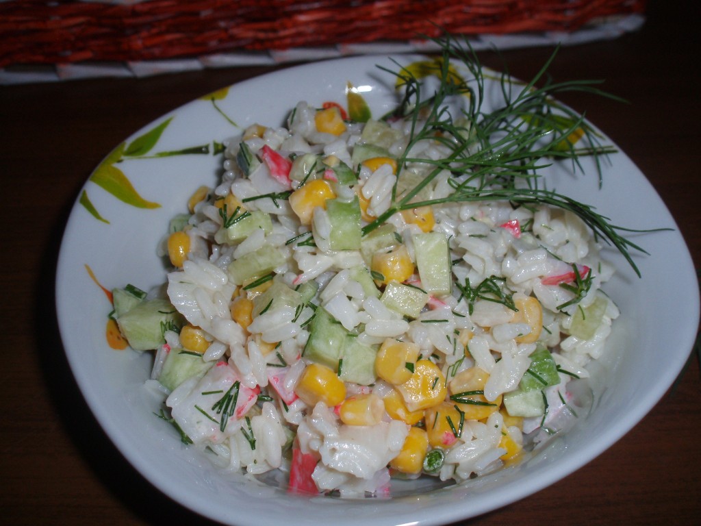 Все перемешать. Если надо, добавить соль, перец. Заправить салат майонезом. Вкусный, сытный салат с крабовыми палочками, рисом и огурцом готов.
