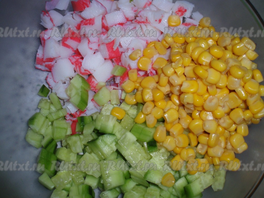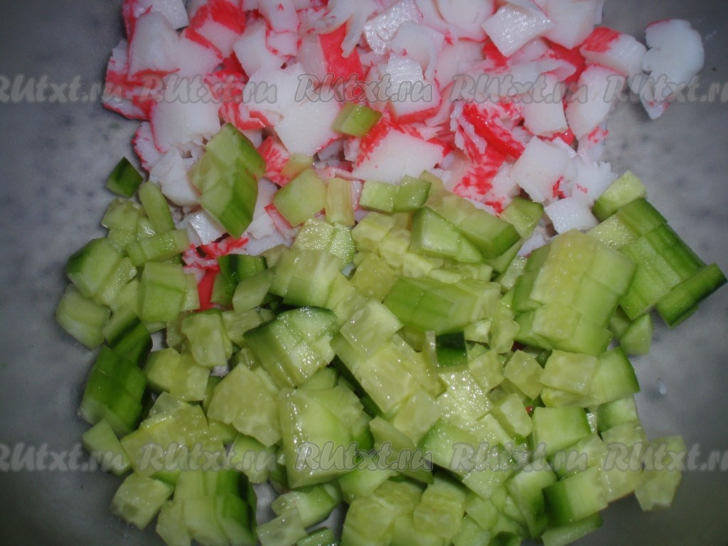 Огурец нарезать небольшими кубиками, добавить к нему мелко нарезанные крабовые палочки.
