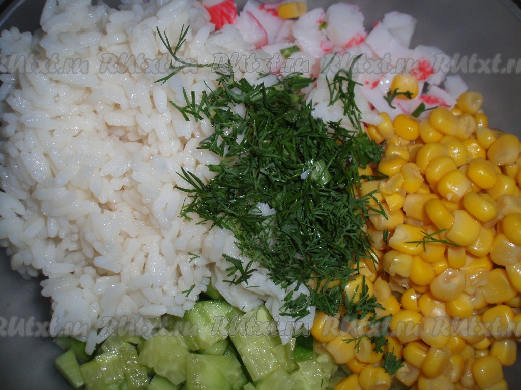 Добавить в салат отварной охлажденный рис. Для того чтобы рис получился рассыпчатым, для варки риса соотношение сухого риса и воды должно быть 1:2. Я использую обычно пропаренный рис, он не склеивается. Мелко порубить укроп и тоже добавить в салат.