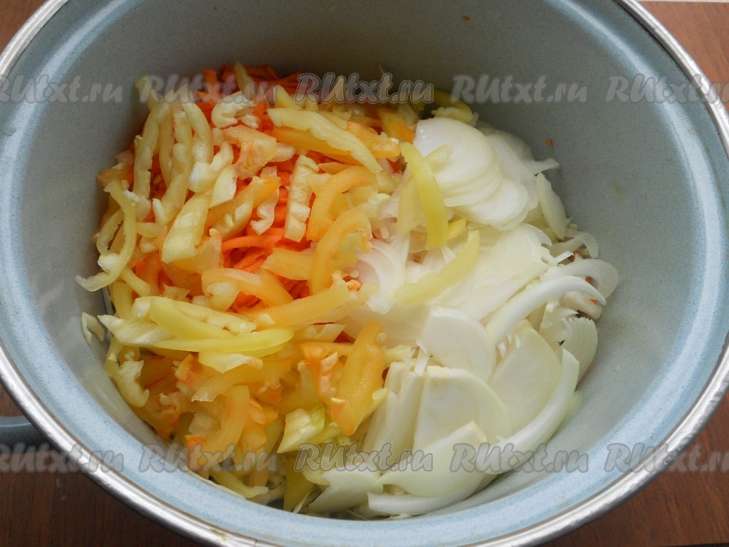 Добавить нарезанный тонкими полукольцами репчатый лук и нарезанный соломкой сладкий болгарский перец.