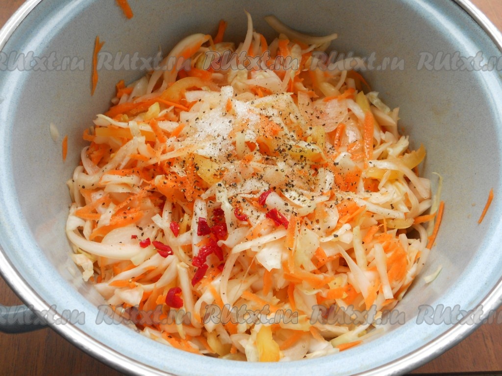 Также добавить в салат мелко нарезанный перец чили, соль, сахар, черный перец, влить растительное масло и уксус.