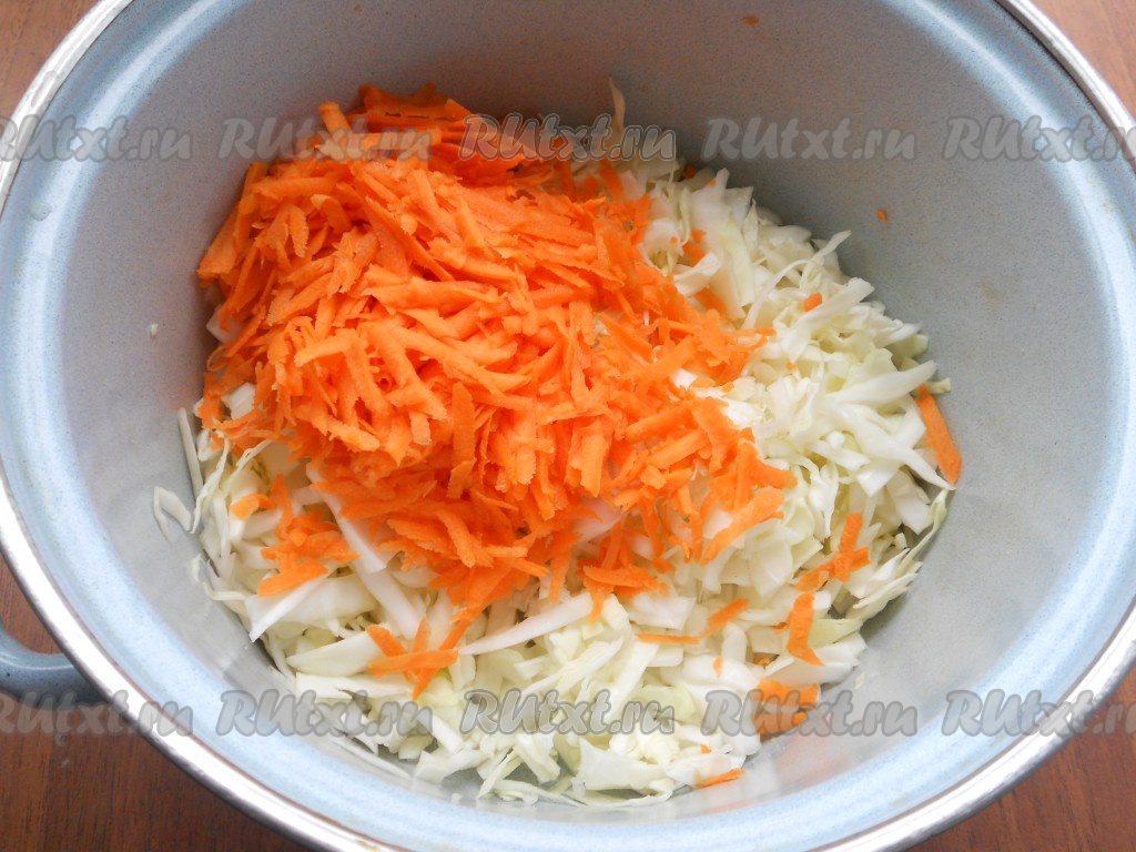 Капусту нашинковать, чуть посолить, помять руками. Добавить натертую на крупной терке сырую морковь.