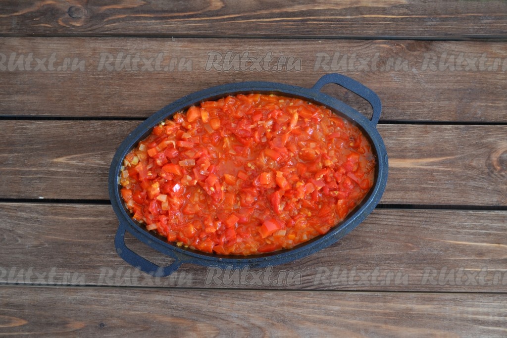 Помидоры для соуса лучше очистить от кожуры, поэтому на 2-3 помидорах нужно сделать крестовые надрезы, обдать кипятком и снять шкурку. Нарезать очищенные помидоры мелкими кубиками и выложить в сковороду к луку и перцу. Добавить по вкусу соль. Помешивая, выпаривать всю жидкость из соуса на небольшом огне в течение 10-15 минут. Приготовленный соус снять с огня и дать немного остыть.