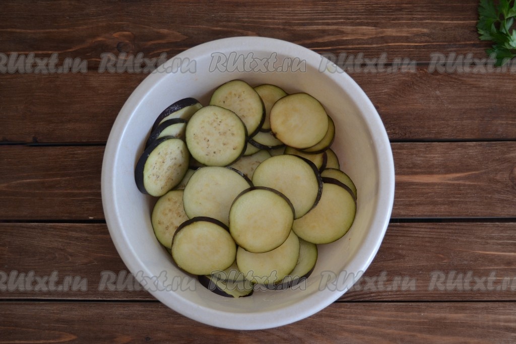 Нарезать вымытые баклажаны кружочками толщиной, примерно, 3-4 мм. Обильно посолить, перемешать и оставить на 20 минут, чтобы ушла горечь. Затем смыть соль и обсушить баклажаны на полотенце.