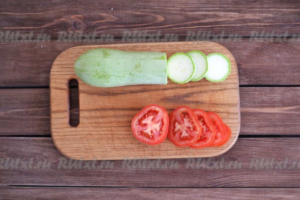 Для приготовления овощного рататуя лучше взять молодые кабачки с мелкими семечками. Кабачки и помидоры вымыть, обсушить и нарезать кружочками.
