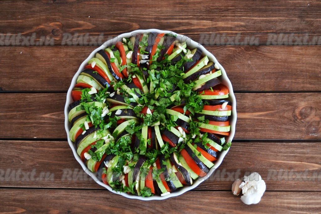 Чеснок очистить, мелко нарезать и посыпать им овощи. Петрушку мелко нарезать, посыпать овощи петрушкой, посолить по вкусу и отправить рататуй из кабачков, баклажанов и помидоров в духовку, разогретую до 180 градусов, на 1 час.