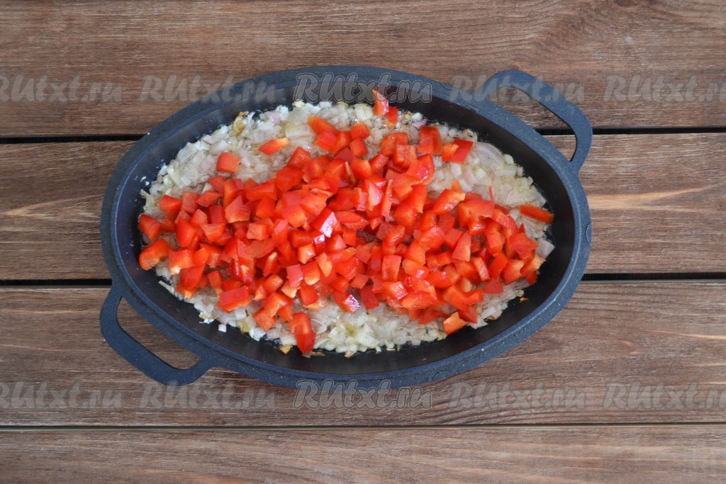 Из болгарского перца удалить короб с семенами. Нарезать перец мелкими кубиками, выложить его к луку и обжарить на небольшом огне в течение 2-3 минут, иногда помешивая.