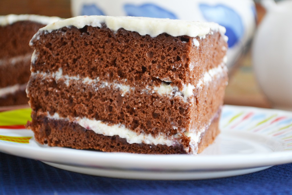 Смазала каждый корж кремом, приготовленным из творога, белого шоколада и сливочного масла, а между коржами выложила вишню без косточек. Собрала торт, смазав верх кремом.
