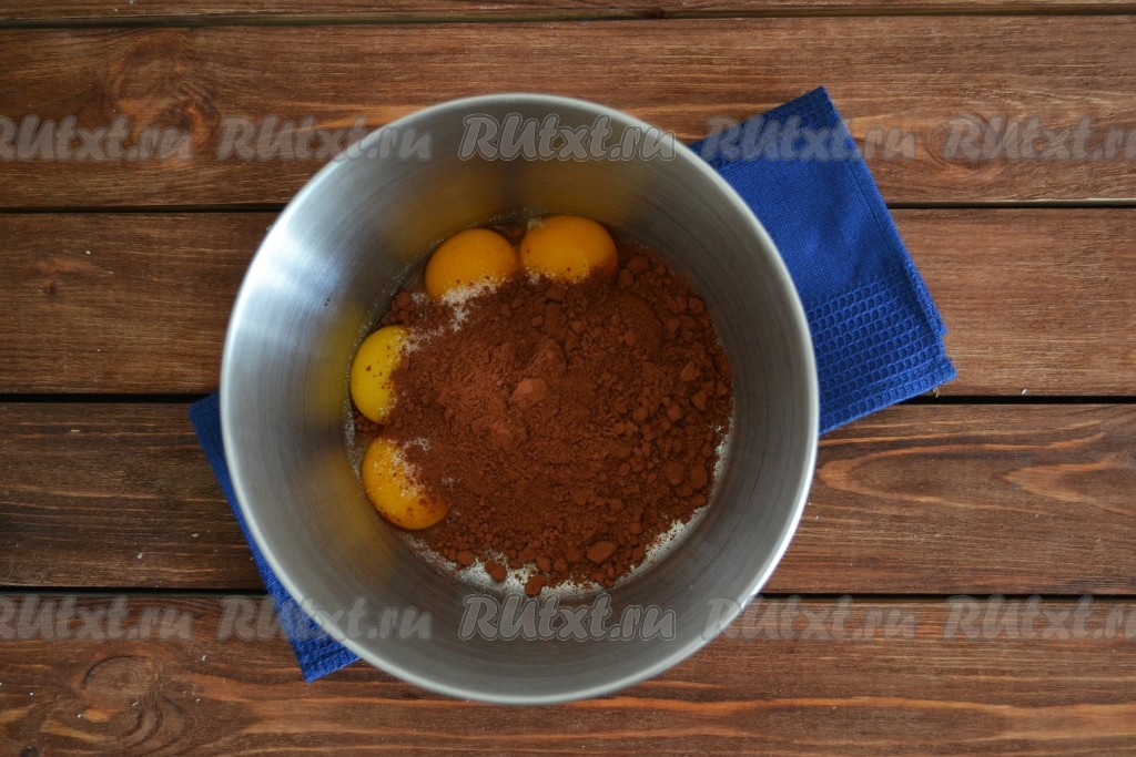 На высокой скорости миксера взбиваем желтки с сахаром и какао в однородную массу. Сахар должен полностью растаять.