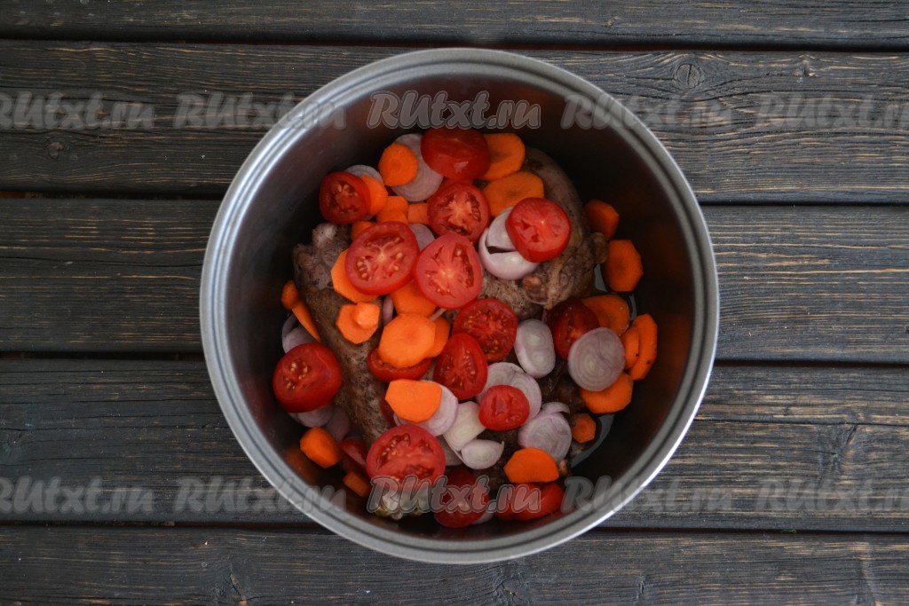 Выкладываем овощи сверху на кусочки гуся, вливаем воду и ставим чашу в мультиварку.