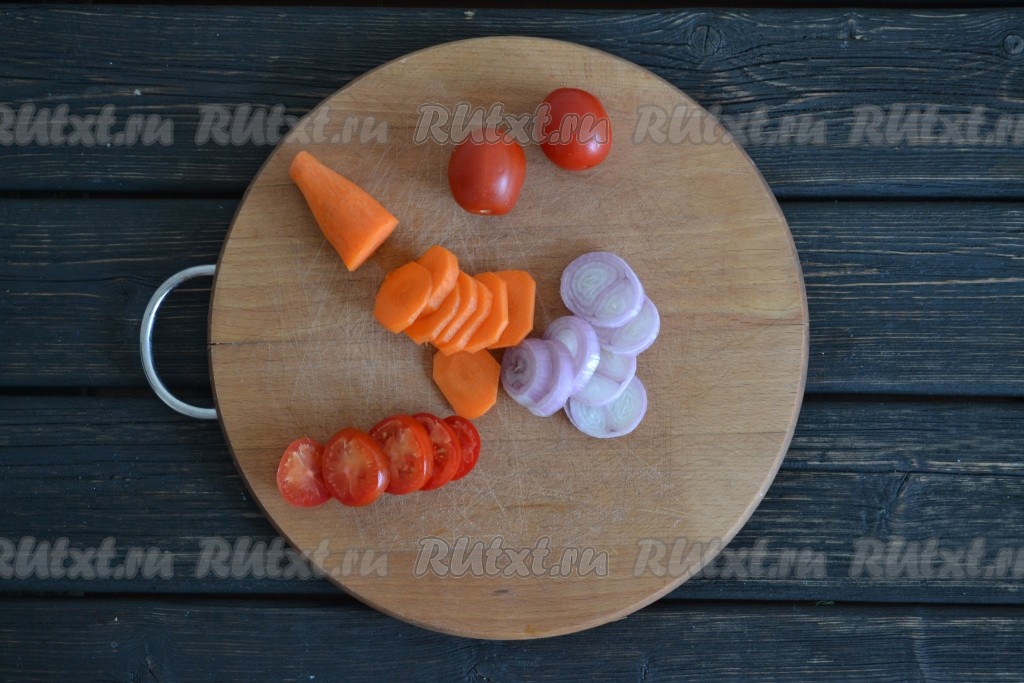 Вымытые и очищенные лук и морковь нарезаем кружочками. Помидоры тоже нарезаем кружками (если помидоры крупные, можно нарезать полукружочками).