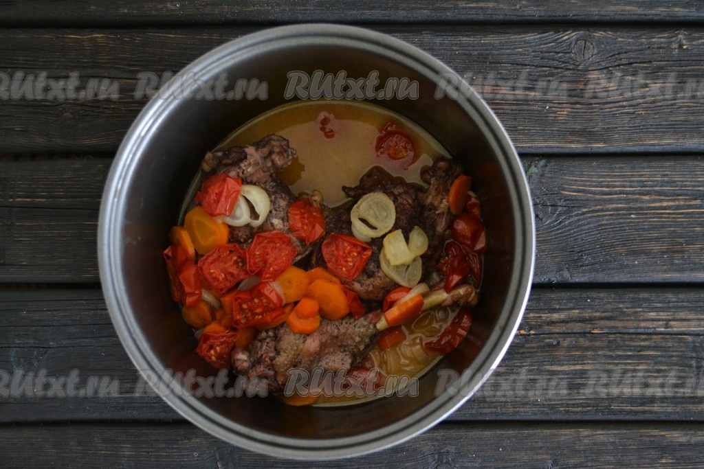 Включаем на мультиварке функцию "Тушение", выставляем таймер на 1 час. По прошествии времени пробуем гусиное мясо, проткнув ножом. Если мясо еще жесткое, то выставляем на мультиварке еще 20-30 минут.
