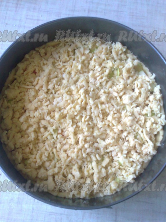 Тесто, отложенное в морозильную камеру, нужно достать и натереть на тёрке поверх пирога.