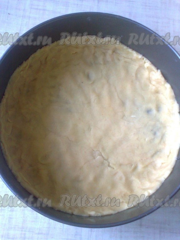 Форму для выпечки (я взяла разъёмную форму диаметром 25 сантиметров) смазать маслом, распределить тесто по форме, сформировав небольшие бортики, высотой около 1-1,5 сантиметров. При желании можно использовать любую другую форму или противень. Если вы готовите пирог, используя противень, борта формировать не нужно.