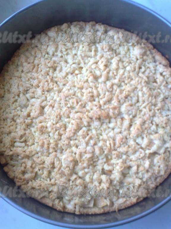 Выпекать тертый пирог с фруктами надо в предварительно разогретой духовке при температуре 180-200 градусов в течение 30-35 минут.