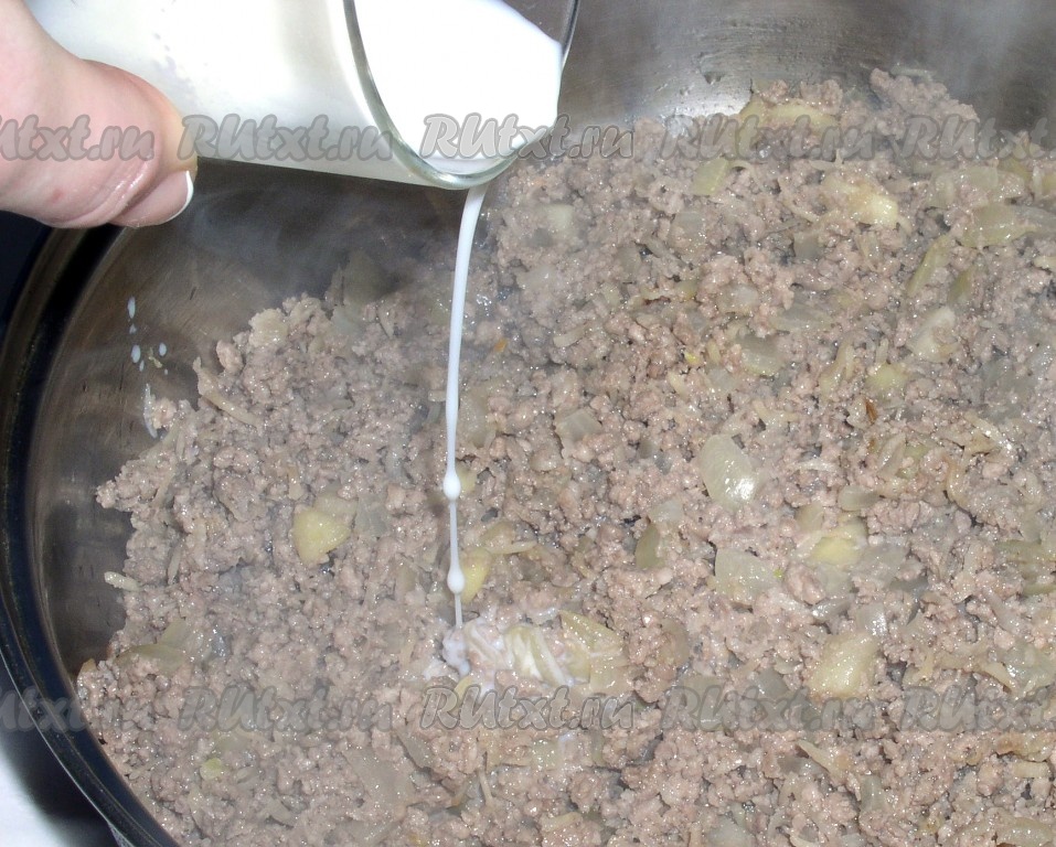 Разбираем фарш на кусочки и выкладываем к овощам, разминаем тщательно, чтобы наш фарш не схватился большой котлетой. Растираем весь фарш вместе с овощами и обжариваем до румяной крошки. Вливаем молоко и, помешивая, тушим до полного впитывания молока.