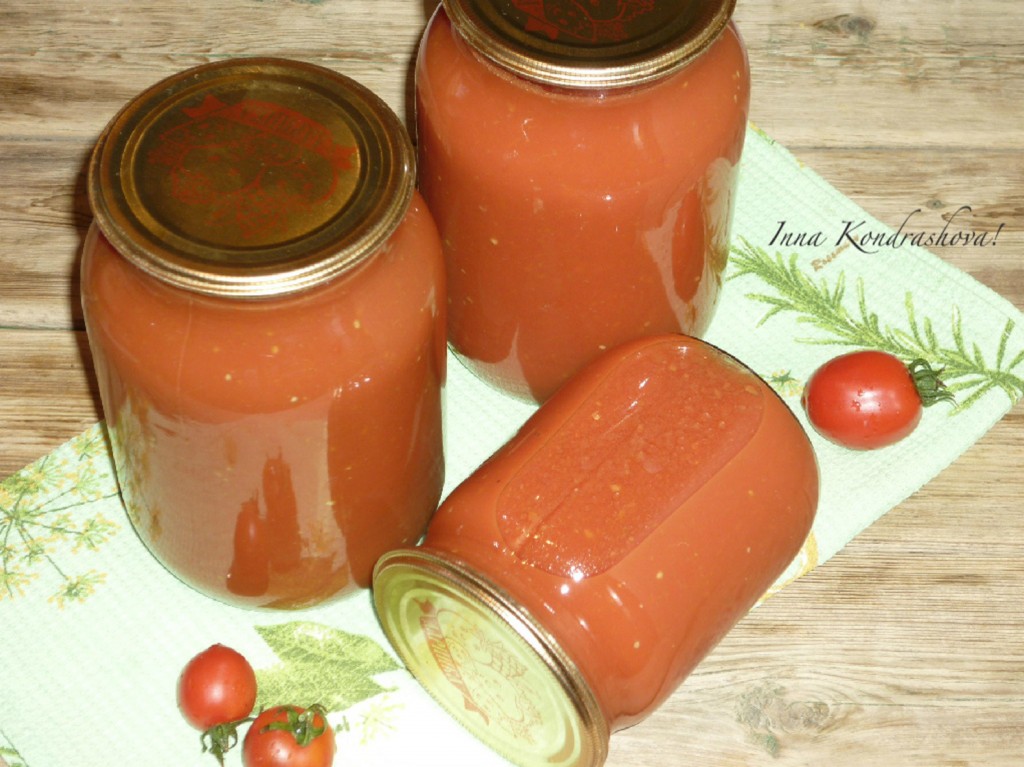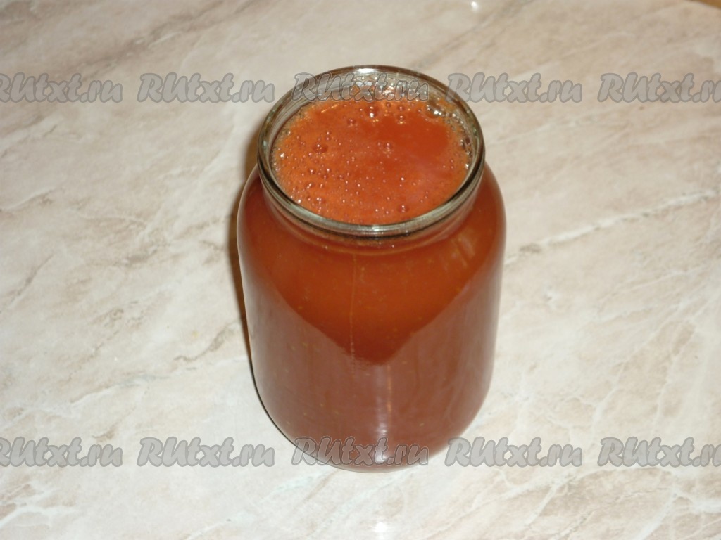 Очень вкусный томатный сок из помидоров, прокрученных через мясорубку, на зиму готов. Такой сок отлично хранится в условиях городской квартиры.
