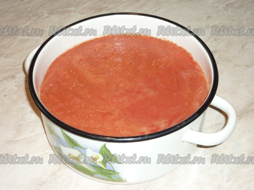 Пропустить подготовленные помидоры через мясорубку. Если жмых получился очень сочным, его можно ещё раз перекрутить, пропуская через насадку. Если нет специальной насадки на мясорубку для приготовления томатного сока, то помидоры нужно пропустить через обычную мясорубку, а затем получившийся томат протереть через металлическое сито, чтобы очистить сок от жмыха (конечно, это трудоемкий процесс, но результат того стоит).