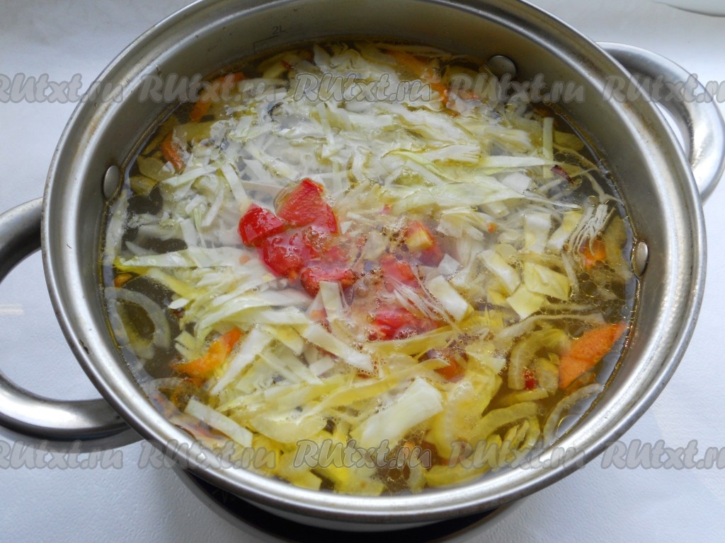 Нашинкованную капусту, нарезанный небольшими кубиками свежий помидор и обжаренные лук с морковью выложить в кастрюлю, когда картофель будет готов.