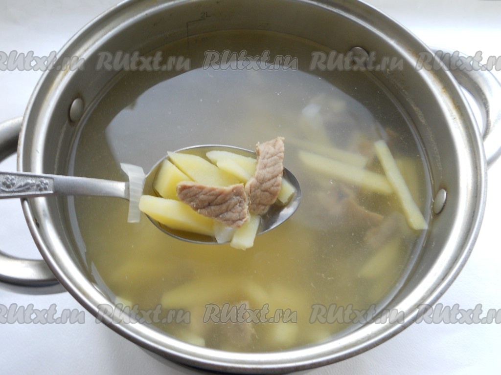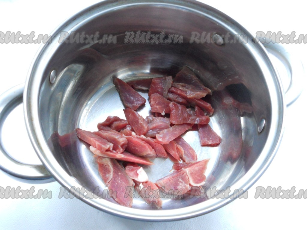 Говядину нарезать тонкими брусочками и поместить в кастрюлю. Залить водой и поставить кастрюлю на огонь. Когда вода закипит, уменьшить огонь, убрать пену, бульон посолить. Варить мясо минут 25-30.