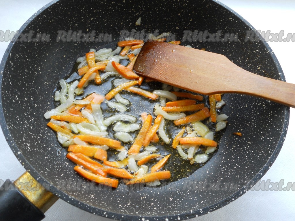 Очищенные лук и морковь нарезать, обжарить до мягкости лука на растительном масле, иногда помешивая.