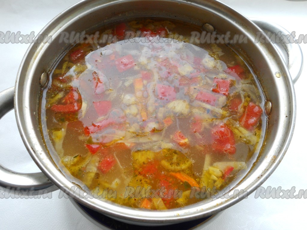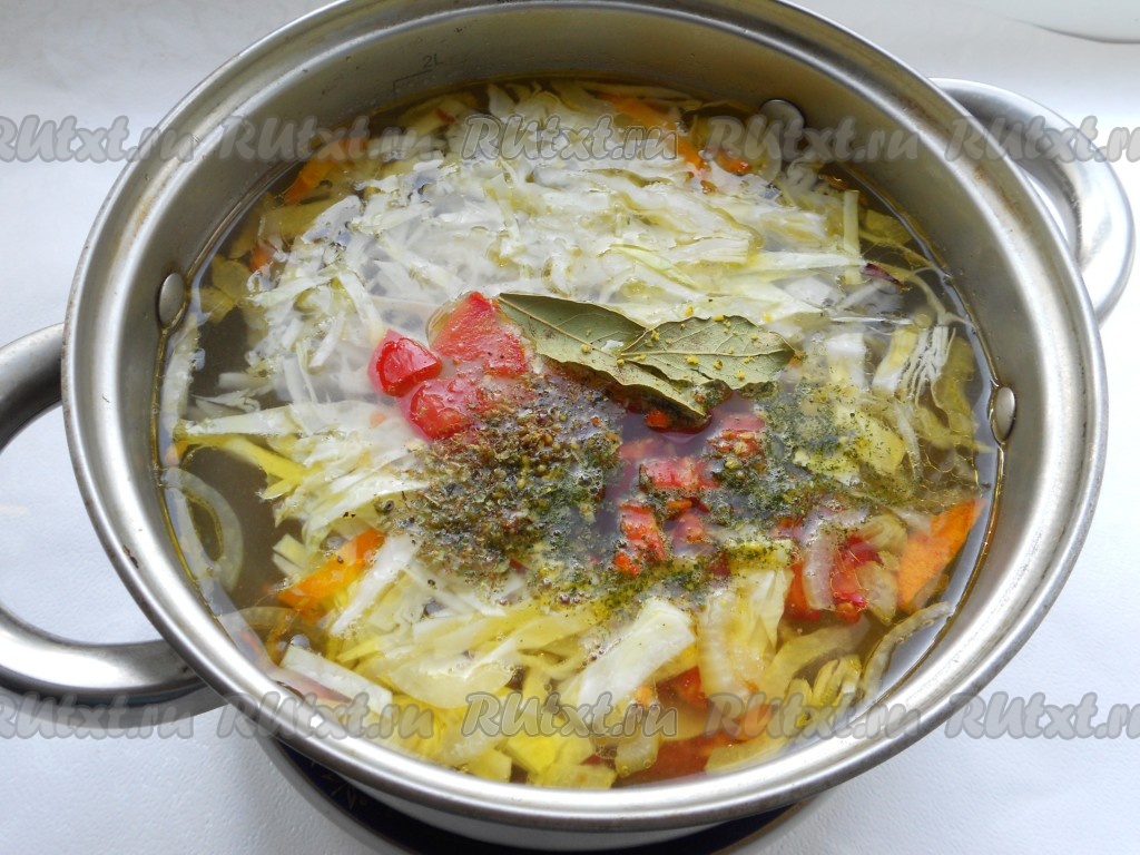 Также добавить в суп специи, приправу и лавровый лист, перемешать. Варить суп на небольшом огне еще 15 минут.