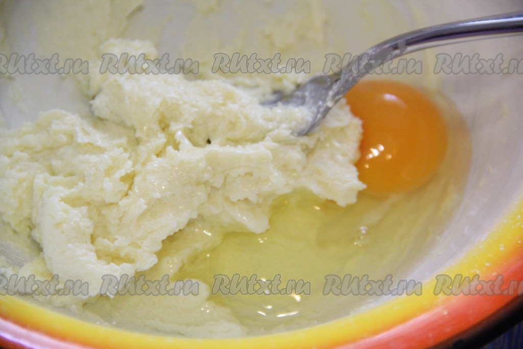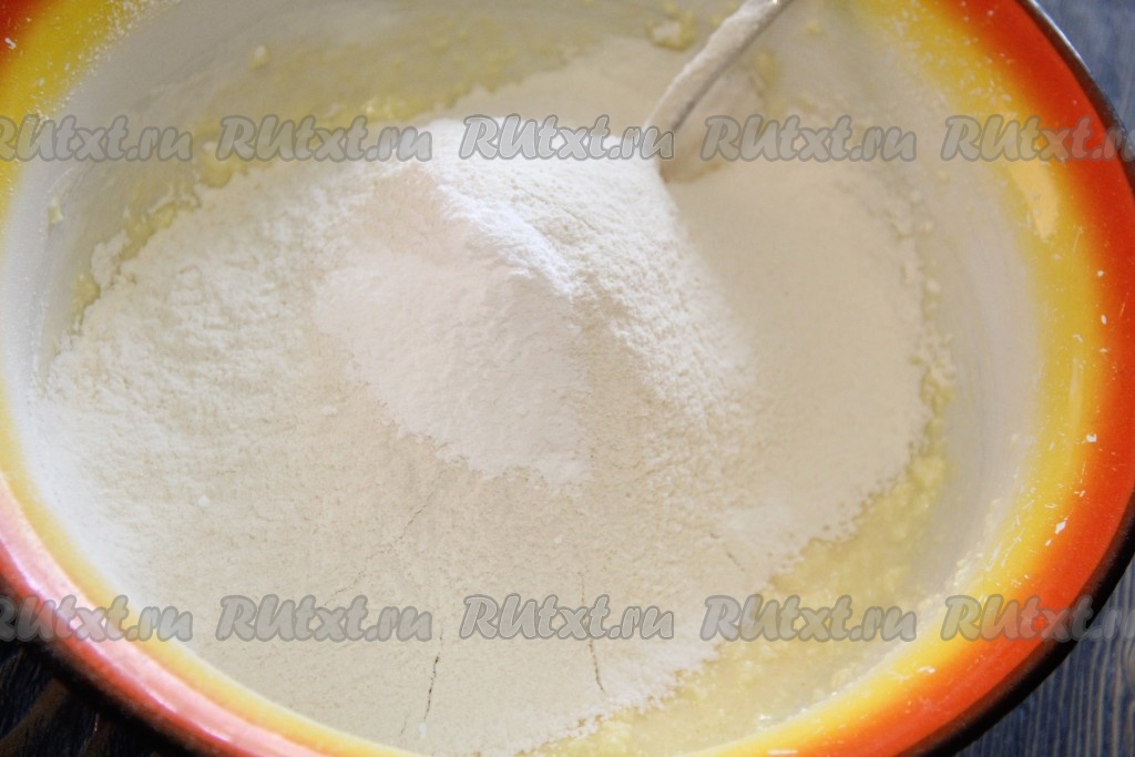 Всё тщательно перемешать вилкой, а затем всыпать просеянную муку, разрыхлитель и соль.