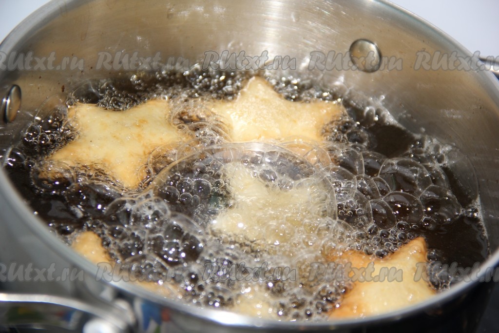 Масло для фритюра хорошо разогреть , если у Вас есть фритюрница, то можно ею воспользоваться. Аккуратно опустить печенье в разогретое масло. Жарить печенье до золотистого цвета.