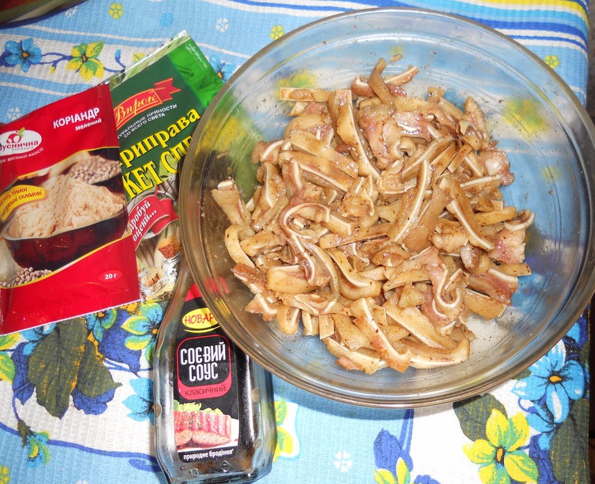 Добавить к свиным ушкам специи и соевый соус по вкусу, перемешать. Поместить закуску в контейнер или накрыть пищевой пленкой и поставить в холодильник для маринования.