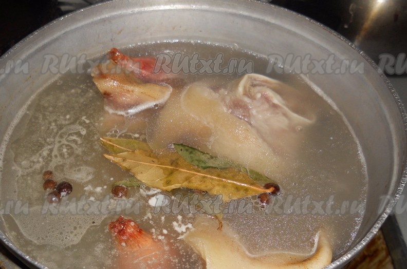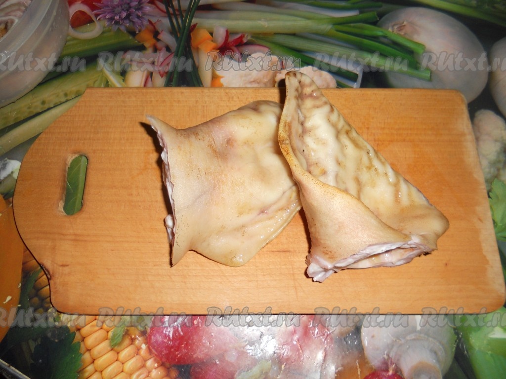 Поместить уши в кастрюлю, залить холодной водой и поставить вариться. Когда ушки закипят, посолить их по вкусу и по истечении 30 минут положить в кастрюлю лавровый лист, душистый перец и лук. Варить ушки 1,5 часа.