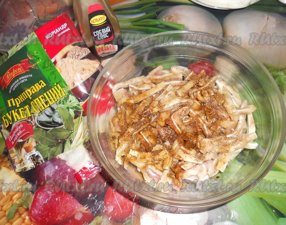 специи (у меня кориандр и смесь специй), также можно использовать приправу к корейской моркови;
